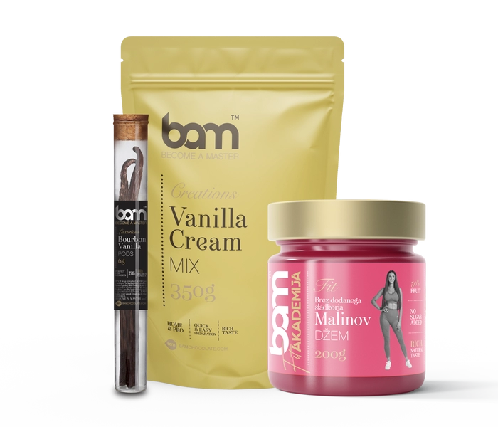 Balení vanilkovo-malinového dortu obsahuje vanilkový krém BAM, který má bohatou vanilkovou chuť a krémovou, hladkou strukturu. Snadno se připravuje a nemusí se vařit, pouze se přidá studené mléko . Přidáním malinového džemu BAM, který obsahuje více než 50 % malin, dodáte vanilkovému dortu svěžest. Džem je vhodný jak ke zmrazení, tak k pečení. Balení obsahuje také vanilkové lusky BAM, které mají výjimečnou vanilkovou chuť a vůni, a jsou proto vhodné k přípravě a obohacení nejrůznějších cukrovinek. Jsou ideální pro přípravu domácího vanilkového krému nebo vanilkové zmrzliny a lze je použít také k ochucení různých sušenek a krémů. Vanilkový krém spolu s lusky a malinami vytváří kombinaci chutí, kterou lze použít k přípravě vanilkového dortu s malinami.
