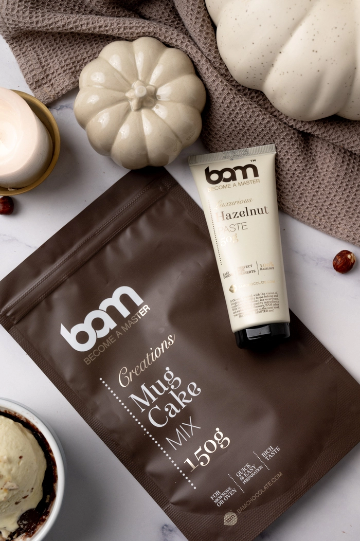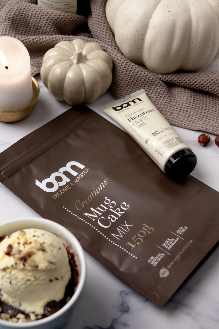 Čokoládový tip: Směs obohaťte vanilkovou pastou BAM. Již upečený Mug Cake ozdobte čerstvým ovocem, BAM polevou, BAM pomazánkou a kopečkem BAM zmrzliny.