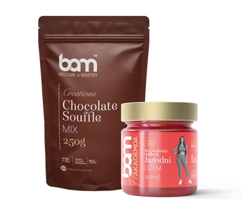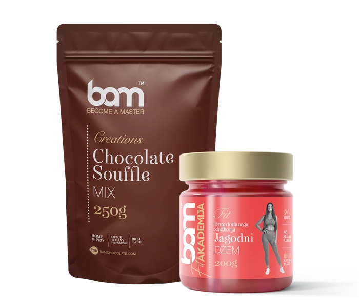 Sada BAM Čokoládové suflé s jahodami obsahuje směs na čokoládové suflé (250 g) a jahodovou polevu (200 g). Balení vytvoří vzdušný a nadýchaný čokoládový dezert, který nadchne milovníky dezertů s malinami. Příprava tohoto lahodného čokoládového suflé je tak rychlá a snadná, že je ideální volbou pro romantickou večeři. Směs pomáhá vytvořit elegantní dezert, i když není mnoho času.