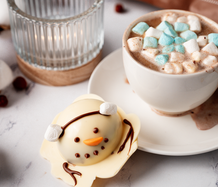 Ponořte sněhuláka do šálku teplého mléka, aby se rozpustil, a vychutnejte si lahodnou horkou čokoládu s lískovými oříšky a marshmallow!