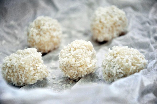 4 Jakmile krém ztuhne, je připraven k tvarování. Ztuhlý krém můžete nabírat čajovou lžičkou a poté z něj rukama tvarovat kuličky. Každou z nich obalte v kokosových lupíncích.