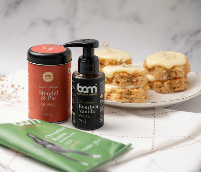 2 Přidejte ovesné vločky BAM Apple Pie, mouku, prášek do pečiva a koření BAM Strudel & Pie. Dobře promíchejte.