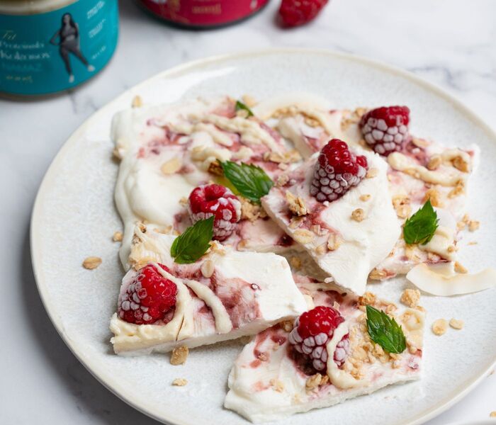 Mražený řecký jogurt s malinovým džemem a kokosovou pomazánkou