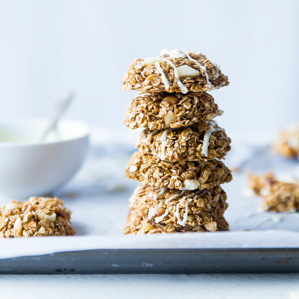 Předehřejte troubu na 180 °C. Dva velké plechy vyložte pečicím papírem nebo silikonovou podložkou. Všechny ingredience smíchejte v jedné velké míse. Míchejte, dokud se všechny přísady nespojí. Těsto bude husté a těžké.