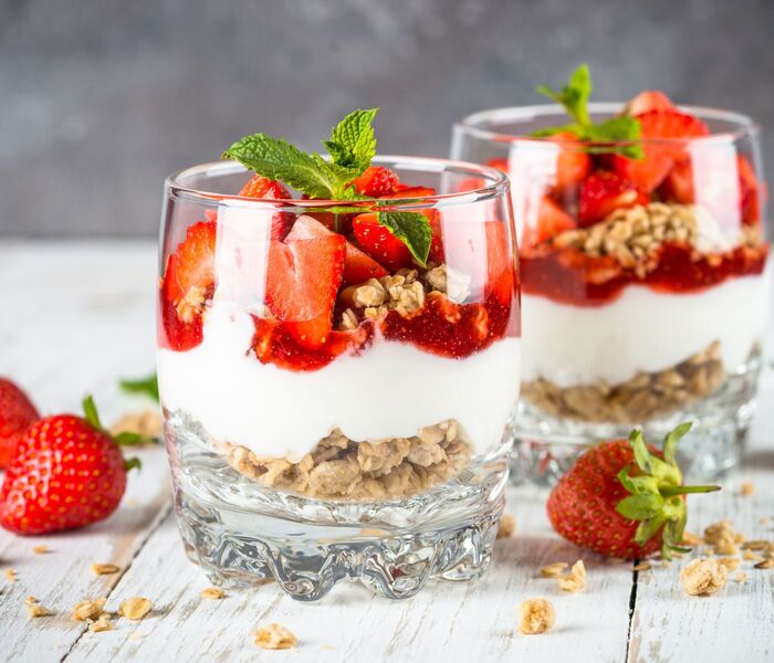 Na dno sklenice rozetřete vrstvu müsli, navrch dejte vrstvu krému z mascarpone, přidejte jahody a lžíci jahodového džemu. Postup opakujte, dokud sklenici nenaplníte. Na závěr naneste vrstvu krému z mascarpone a ozdobte zbylými jahodami a lístky čerstvé máty, pokud je používáte.