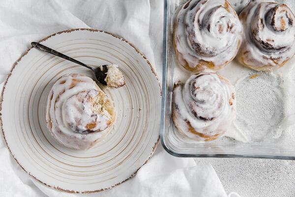 Předehřejte troubu na 180 °C. Odstraňte fólii a utěrku a skořicové rohlíčky pečte 20 až 25 minut nebo dokud nejsou na okrajích lehce zlatavé. Chcete je mít mírně nedopečené, aby zůstaly uprostřed měkké, takže je chcete mít jen lehce dozlatova. Nechte je vychladnout, než je potřete polevou, měly by chladnout 5 až 10 minut.