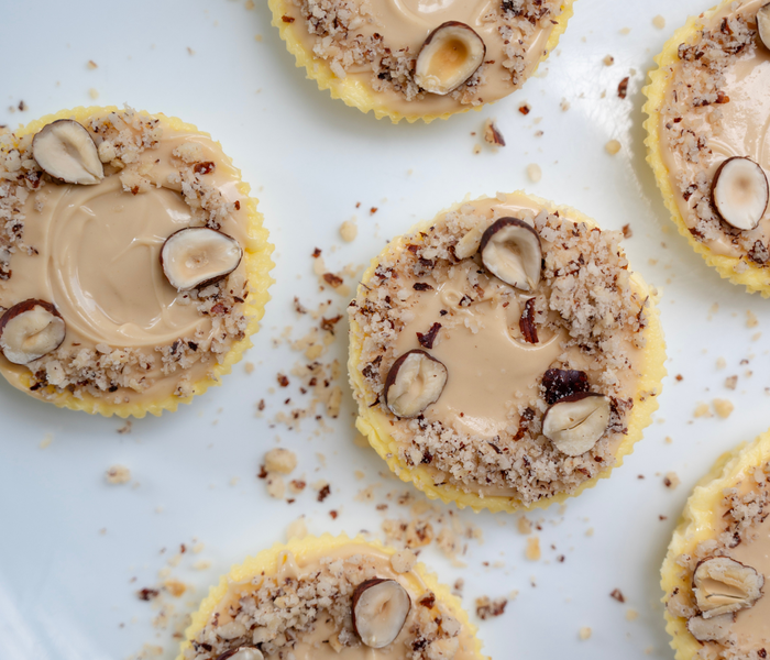 Po upečení nechte mini cheesecaky zcela vychladnout při pokojové teplotě. Po vychladnutí je potřete BAM lískooříškovou proteinovou pomazánkou a nakonec je posypte nasekanými lískovými oříšky pro lepší texturu a chuť.