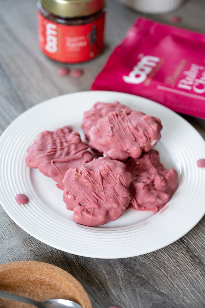 Po dvou hodinách BAM Ruby čokoládu rozpustí. Když jsou kopečky pevné, pomozte jim jeden po druhém do rozpuštěné čokolády Ruby. Kopečky položte zpět na plech s pečicím papírem a vraťte je na krátkou dobu do mrazáku, jen na tak dlouho, aby čokoláda zcela ztuhla.
