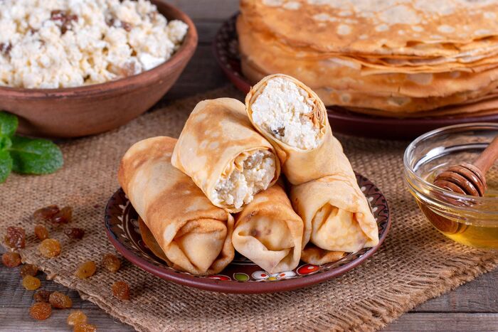 Když jsou palačinky upečené, rozetřete na každou palačinku lžíci tvarohové náplně a opatrně je srolujte nebo přeložte.